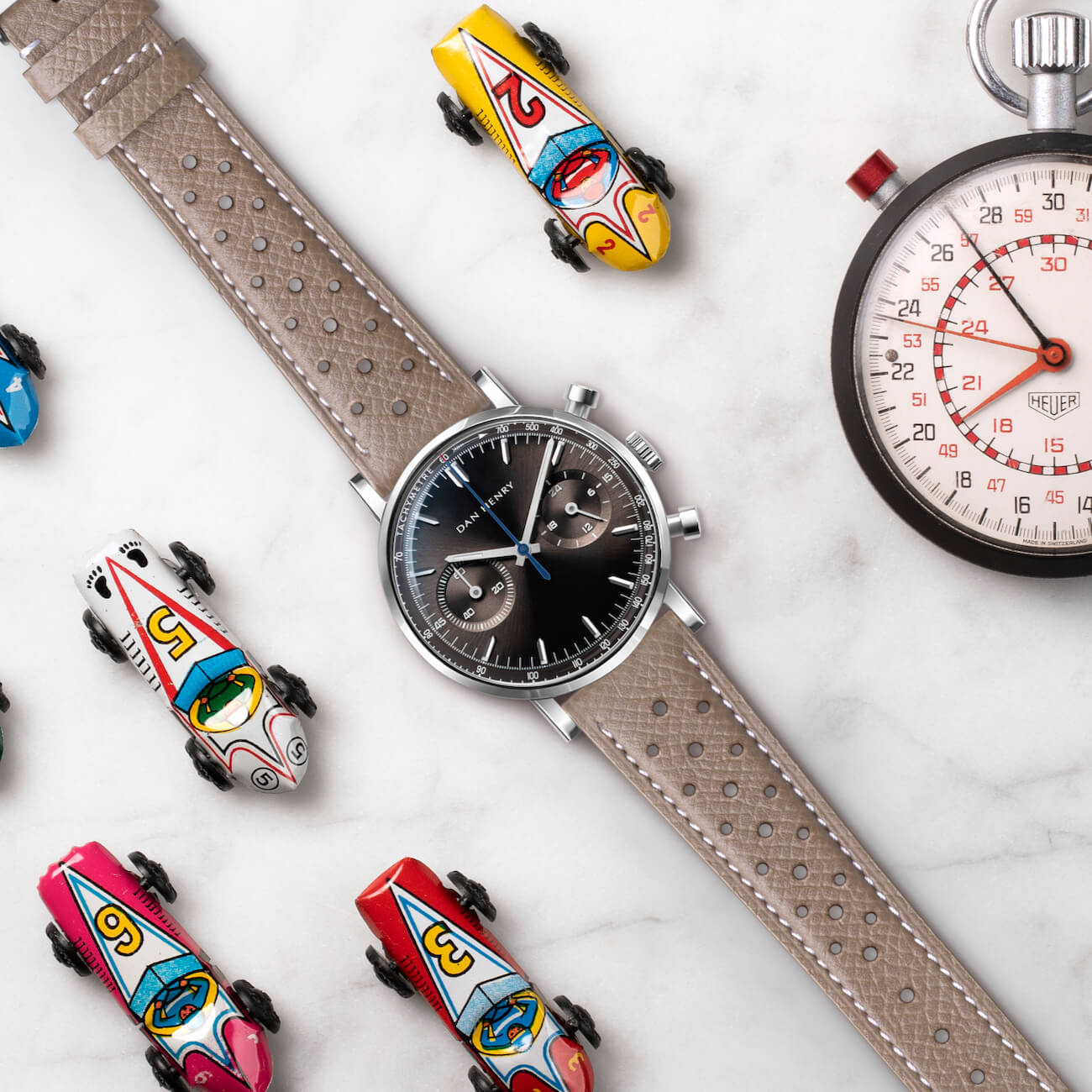 Our rally-style perforated racing strap will transform your Dan Henry watch into a rugged sports chronograph with the look of the 1960s.